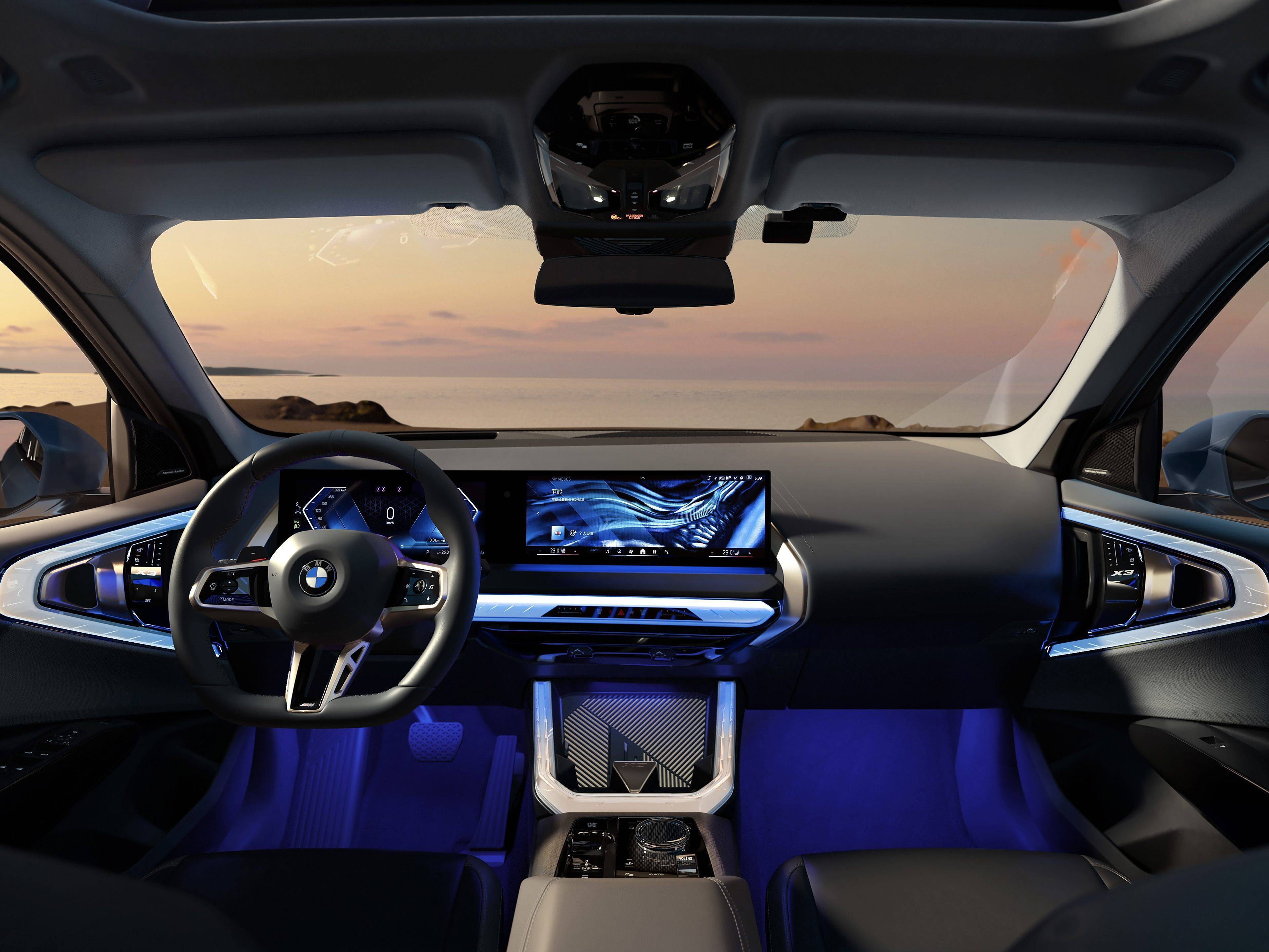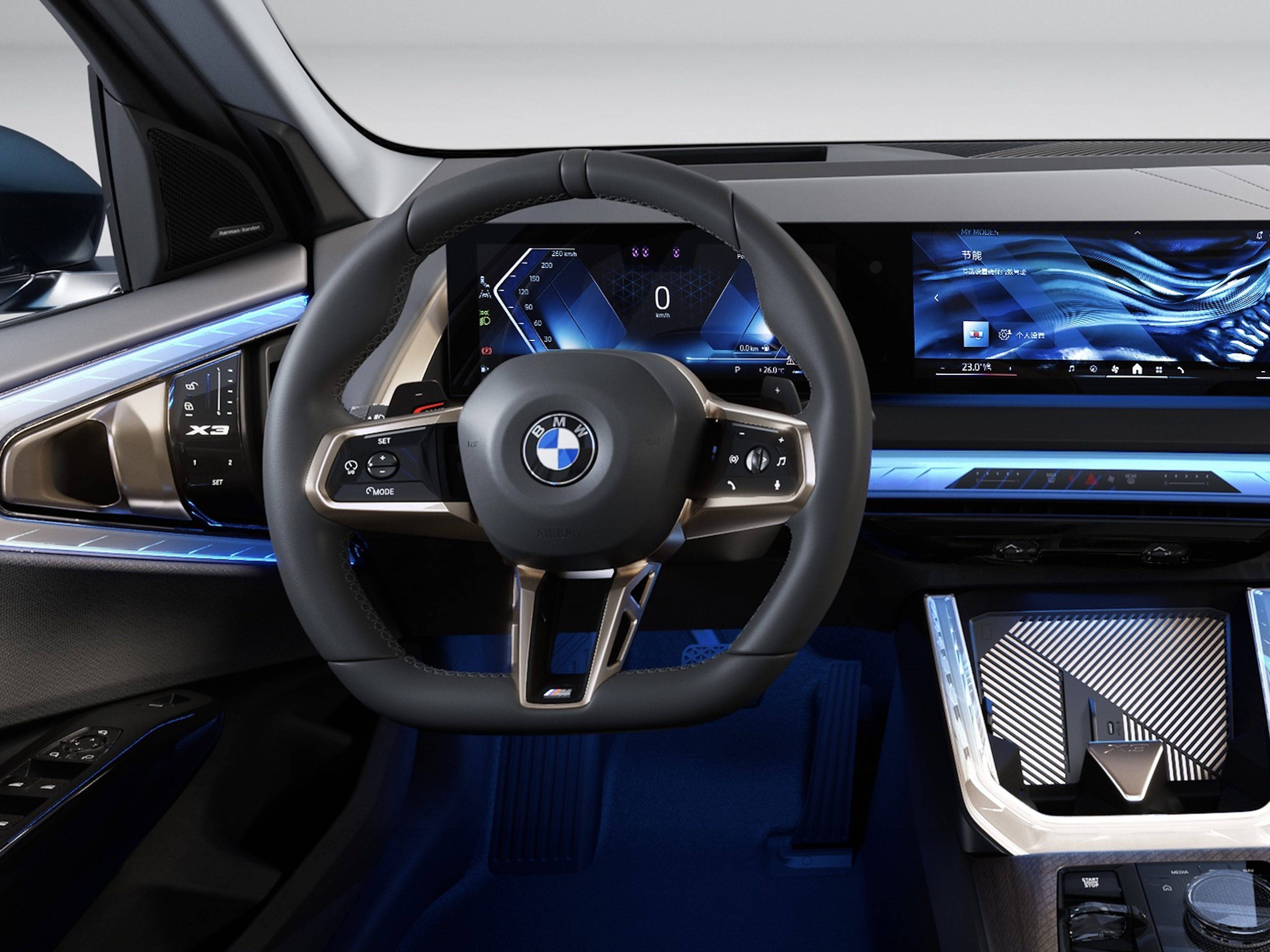 车尾部分,全新宝马 X3 长轴距版采用了全新的设计语言。箭羽型 LED 尾灯造型独特,点亮后辨识度极高,与车头的大灯组相呼应,形成了独特的视觉效果。双边共双出的排气布局,粗壮的排气口搭配银色的装饰条,进一步彰显了车辆的运动属性。此外,车尾的扰流板设计也增加了车辆在高速行驶时的稳定性。内饰:豪华升级,科技感爆棚坐进全新宝马 X3 长轴距版的车内,一股浓浓的豪华科技氛围扑面而来。内饰设计在保留宝马经典元素的基础上,进行了全面升级,整体质感有了显著提升。中控台采用了大量软性材质进行包裹,触感柔软舒适,搭配精致的缝线工艺,细节之处尽显豪华品质。车内配备了一体式悬浮曲面屏,集成了第 9 代 (BMW) 操作系统 ,“零层级” 界面配合全新 “巧控浮窗”,以地图为底打造个性化主页,操作更加直观便捷,响应速度也更快。系统还支持智能语音交互功能,通过强大的语音识别技术,能够准确理解驾驶者的指令,实现导航、多媒体控制、车辆设置等多种功能,让驾驶变得更加轻松。
